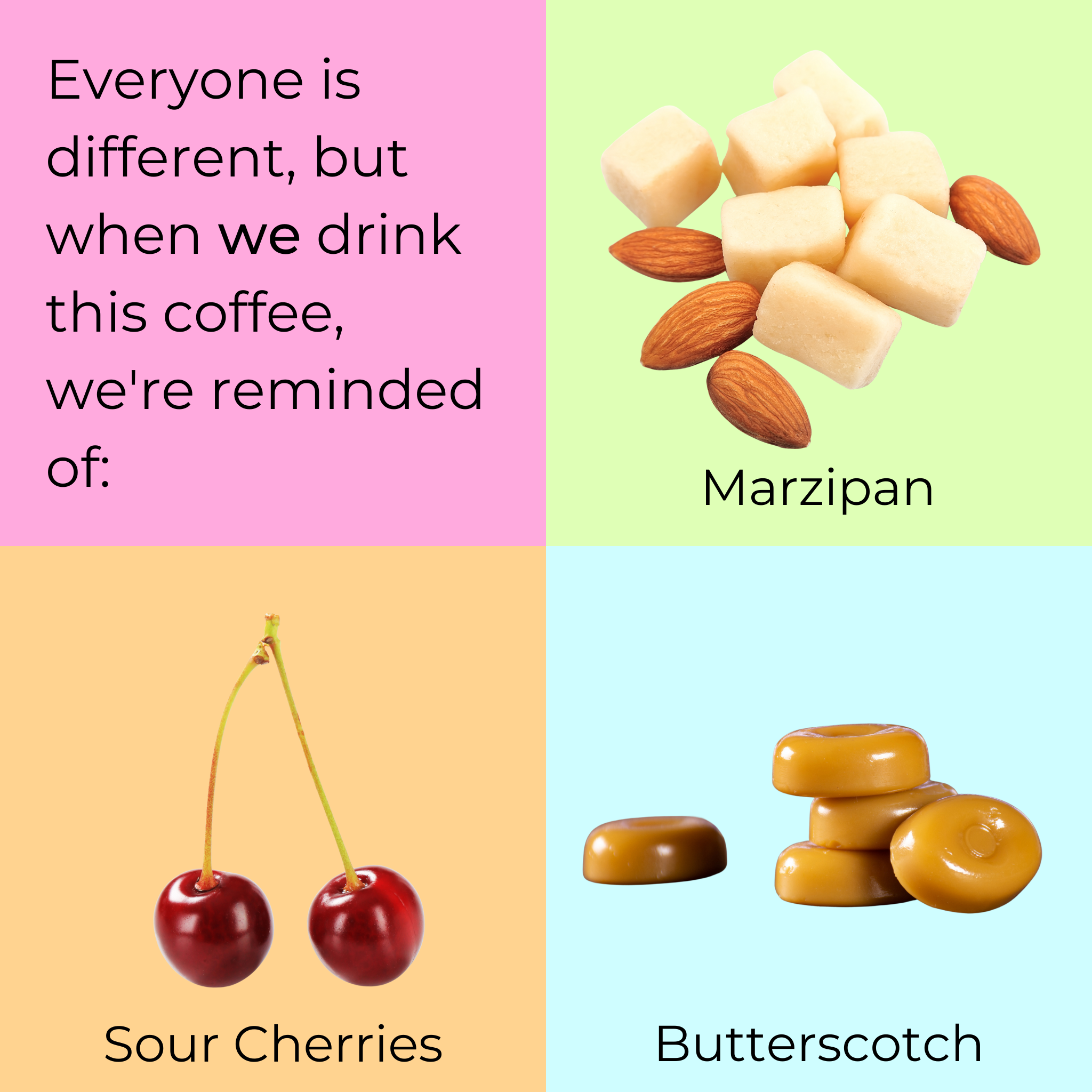 When we drink this coffee, we're instantly reminded of Bakewell tart and Battenberg cake. It has an addictive sour cherry acidity and a sweet marzipan thing going on. In the few days after roasting, we found it almost unbearably 'fizzy', but give it a bit more rest (two weeks ideally) and everything settles down and becomes much more balanced. Still, there is so much complexity in this lot and every time we brew we're finding something new.